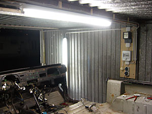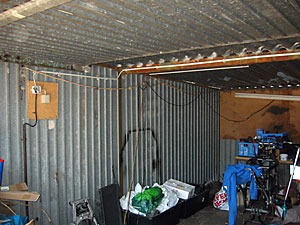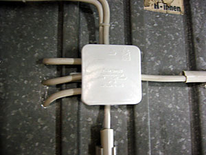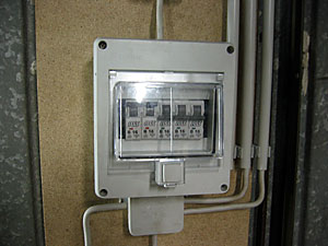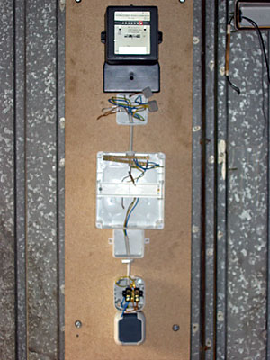 Der ankommende Strom wird erstmal durch einen eigenen Zähler geleitet – damit's nicht später Ärger mit den mir so wohl gesonnenen Nachbarn gibt, und wird dann über einen Sicherungskasten an die diversen Verbraucher (Neonröhren und Steckdosen) verteilt.