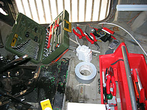 Aber der Haufen Zeugs nutz einem natürlich überhaupt nichts, wenn er am Garagenboden verteilt rumliegt. Alles muß fachkundig installiert und letztendlich auch an die Stromleitung angeschlossen werden.